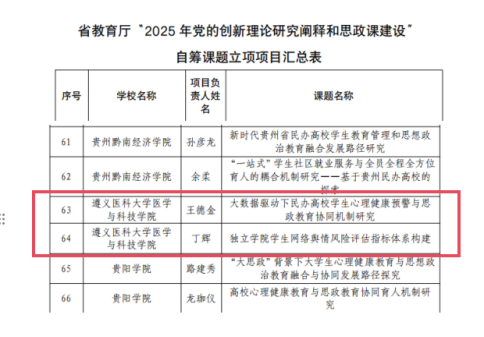 近日,贵州省教育厅公布2025年党的创新理论研究阐释和思政课建设课题立项结果通知,我校运动健康学院王德金、丁辉老师申报的《大数据驱动下民办高校学生心理健康预警与思政教育协同机制研究》《独立学院学生网络舆情风险评估指标体系构建》获省教育厅立项。
