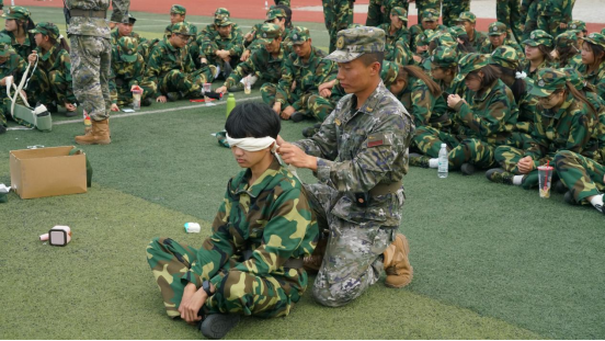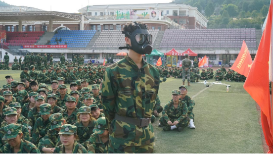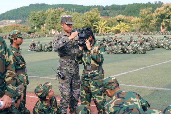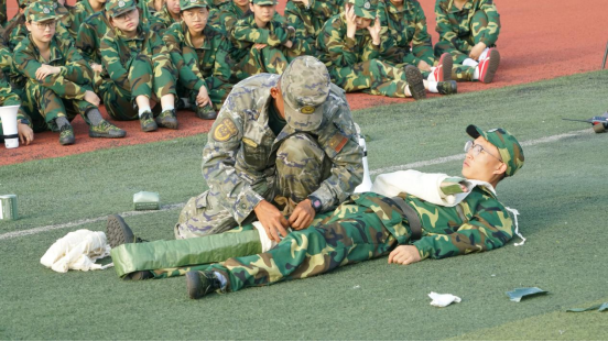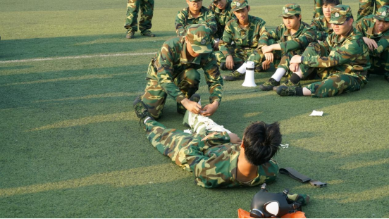 与此同时,更具“军旅”特色的战场医疗救护、核生化防护等科目的培训也在同步开展。承训教官凭借丰富实践经验,现场演示创伤包扎、止血、骨折固定及伤员搬运等战场救护操作,详解核生化防护要点。三角巾、旋压式止血带、夹板等在教官手中灵活运用,快速高效完成“伤处”处置;新生们两两分组,轮流扮演伤员与救护者,在实践中熟悉操作流程,掌握技巧要点。训练场上,一幕幕模拟救护伤员的场景,让严肃的军事训练增添了救死扶伤的人道主义温度。