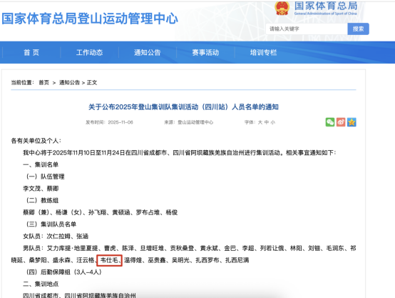 中国登山队是具有光辉历史与崇高使命的国家级队伍。韦仕毛的入选,既是对其个人长期不懈努力与卓越发展潜质的高度认可,更是我校体育学科育人成果的生动实践。从校园日常训练到国家集训平台,韦仕毛以坚定意志与专业热爱,生动诠释了我校“明德笃学,践履求真”的校训精神。学校期待其在国家集训队的更高平台上锤炼本领、成长进步,未来在高海拔登山领域展现我校学子风采,绽放“科院光芒”。