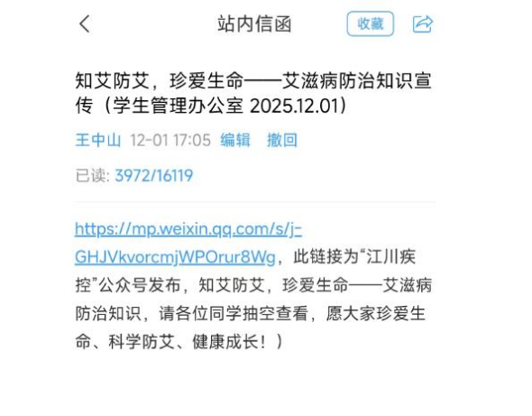 2025年12月1日是第38个“世界艾滋病日”。为深入贯彻落实国家关于艾滋病防治工作的重要决策部署,积极响应“社会共治,守正创新,终结艾滋”的主题号召,2025年11月26日至12月1日,学生工作部(处)、后勤处和校团委在校内集中联合开展了一系列内容丰富、形式多样的宣传教育活动。此次活动面向全体在校学生,采取线上线下相结合的方式,扎实普及防艾知识、传递科学理念、营造关爱氛围,取得了良好成效。