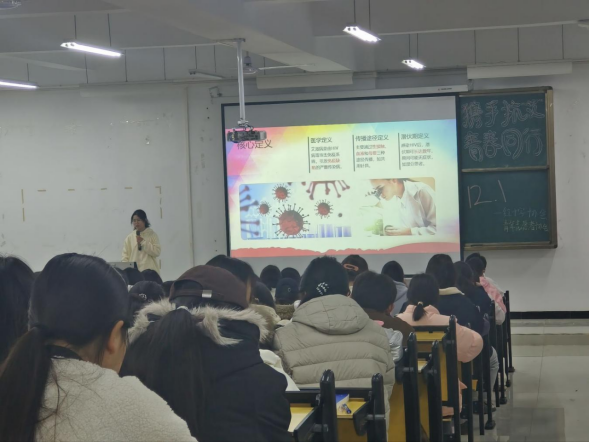 11月28日,三部门联合举办“科学防艾,以爱筑防”专题讲座,为活动拉开序幕;活动期间,全校各班级统一召开“携手抗‘艾’,青春同行”主题班会,实现防艾教育全覆盖、无盲区;校团委同步开展“室内宣讲+室外实践”双向活动,通过知识讲座、趣味竞答等活动深化理论认知,借助图书馆门口主题签名、“青春无艾”手抄报展示等方式强化互动体验;线上依托官方微信公众号、班级课群等平台,推送防艾科普专题内容,以学生喜闻乐见的形式扩大宣传覆盖面。