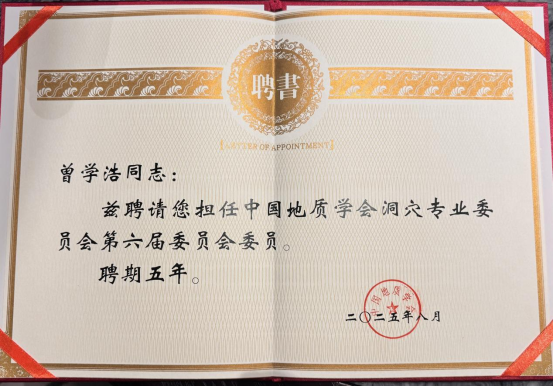 2025年11月29日,中国地质学会洞穴专业委员会换届会议暨第六届委员会第一次会议在广西桂林圆满落幕。我校运动健康学院绳索技术专项教师曾学浩受聘为该专业委员会第六届委员。