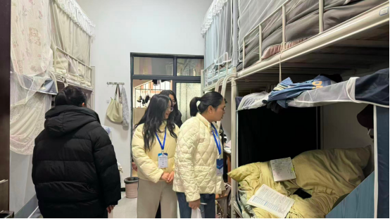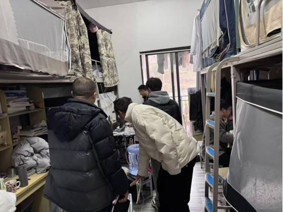 随后,检查人员分为9个工作组,对全校9幢学生公寓逐间开展排查。检查组聚焦违规使用大功率电器、私拉乱接电线、存放易燃易爆物品等核心安全隐患,细致核查消防安全与用电安全情况,同步检查宿舍卫生状况及公共设施完好程度,确保隐患排查无盲区、无死角。检查过程中,工作人员对照节前宿舍安全风险要点,向学生逐一开展安全提示。