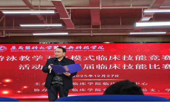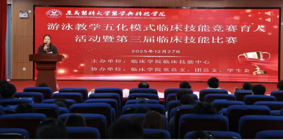 为推动临床学院游泳教学五化模式朝着高质量、可持续的方向稳步迈进,切实提升医学生的临床实践能力与综合素养,2025年12月27日,临床学院临床技能中心举办游泳教学五化模式临床技能竞赛育人活动暨第三届临床技能比赛,临床学院院长陈双华与返聘专家杨春丽教授出席指导。比赛参照全国临床技能大赛“赛站式”模式,设置五个赛站,第一站为病史采集、第二站为内科技能、第三站为外科技能、第四站为急救技能、第五站为辅助检查站。来自2021级、2022级临床医学及麻醉学的16支代表队,共64名学生参加比赛。