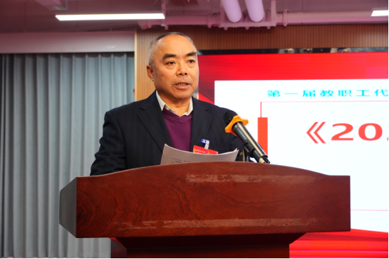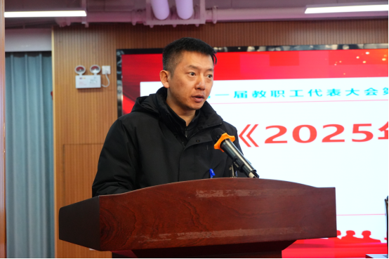 提案审查组组长汤佰东,工会主席谭飞,财务处处长吴军,党务综合部副部长、学校办公室副主任邹钦成分别作《2025年提案工作完成情况及2026年提案立项情况报告》《2025年工会工作报告》《2025年财务工作报告》和《学校“十五五”规划报告》。