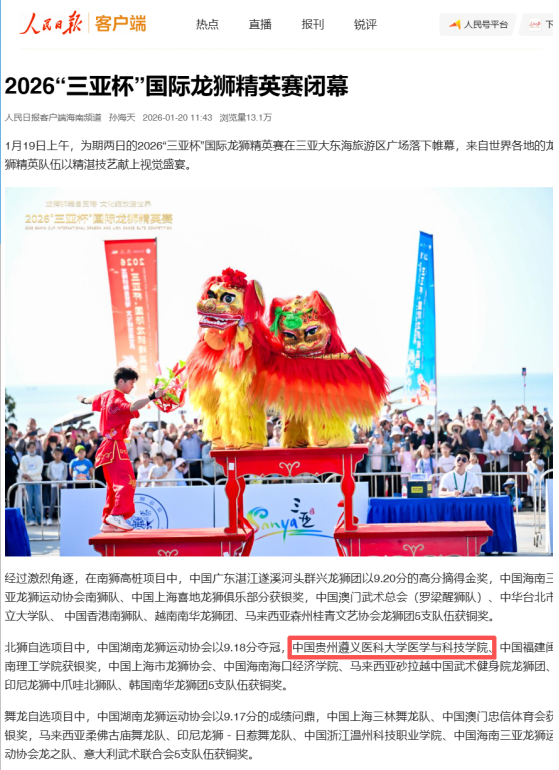 在北狮自选套路项目中,我校龙狮代表队在罗精、周同军两位老师的带领下,与中国湖南、上海及马来西亚、印度尼西亚、韩国等国内外7支顶尖队伍同台角逐。队员们凭借扎实的功底、默契的团队协作与富有创意的套路编排,将北狮运动的力与美展现得淋漓尽致,最终脱颖而出,斩获该项目国际银奖(第二名),实现我校在该项国际赛事中的历史成绩突破。本次赛事受到《人民日报》客户端的关注报道。