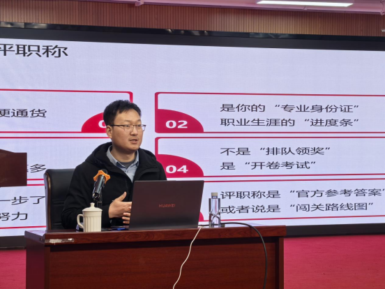 培训中,吴华锋围绕“为什么要评职称”“青年教师初期生涯规划”“职称申报评审过程”“各层级职称申报条件”及“附则注意事项”五大核心模块展开讲解。他结合《贵州省高等学校教师系列专业技术职务任职资格申报评审条件(试行)》政策文件,详细解读了助教、讲师、副教授的学历资历条件、任职条件与业绩成果,重点梳理了职称申报的时间节点、系统操作流程、材料准备规范等关键环节。还分享了较易达成的申报条件组合,为教师们提供了可落地的申报指引。