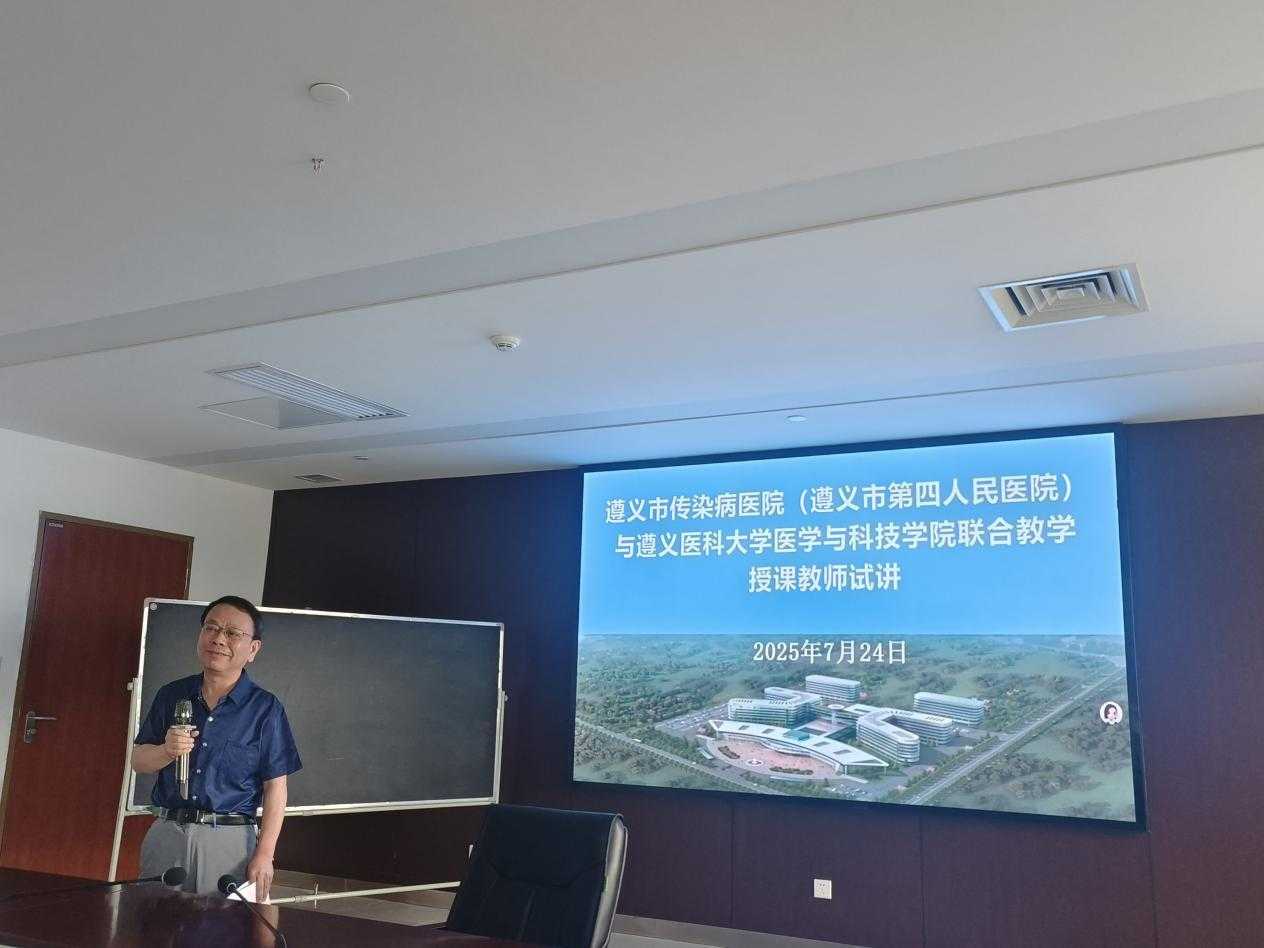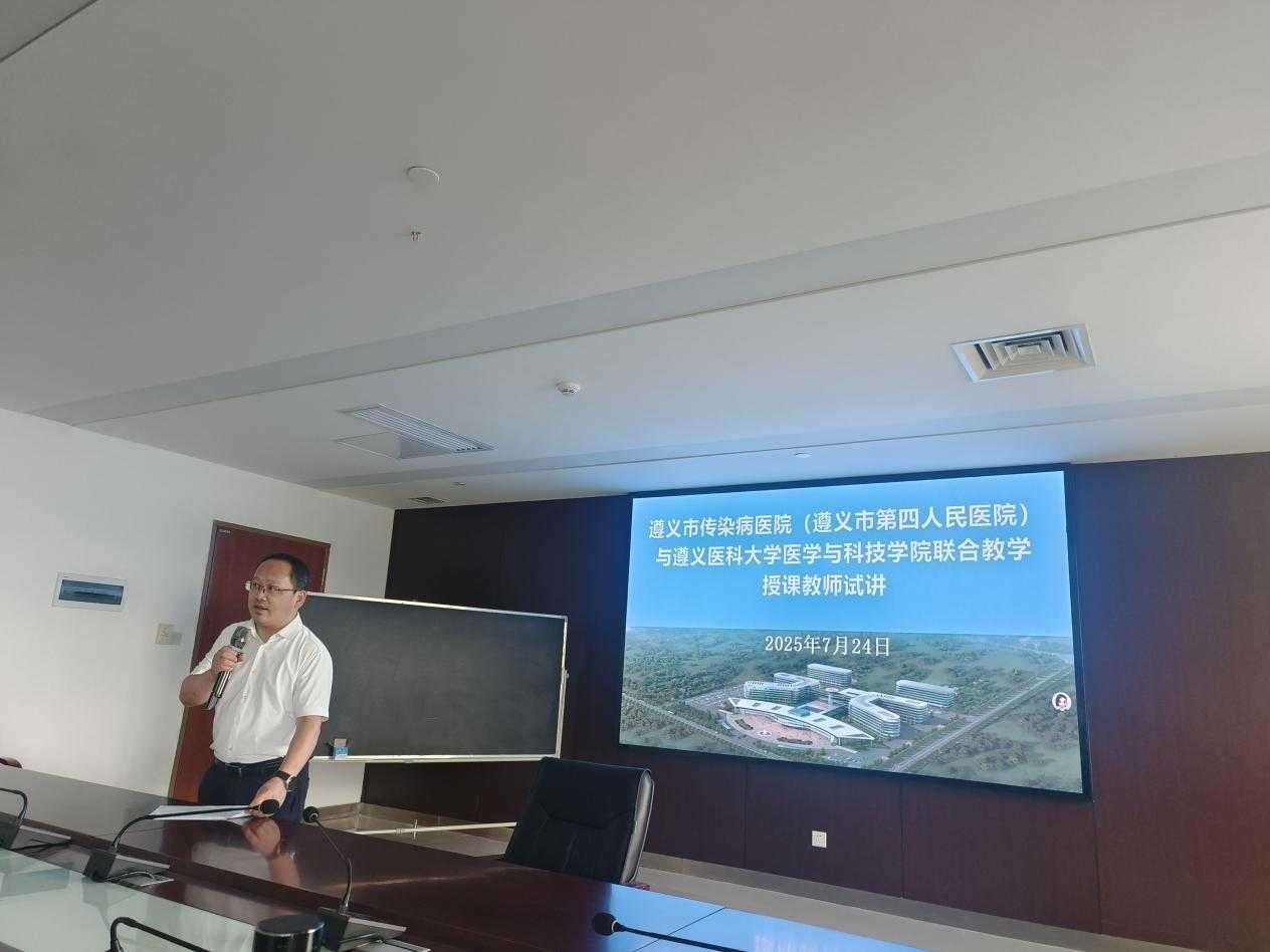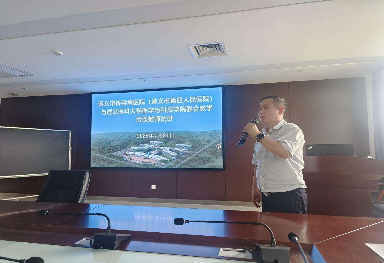 为了推进医教融合深化院校协同育人机制,提升临床医学教育教学质量,为国家培养更多的高素质医学本科应用型人才,2025年7月24日,临床学院院长陈双华、教务科副科长李熙到临床教学医院遵义市第四人民医院出席授课教师试讲活动。遵义市四医副院长黄毅、副院长罗柱文、副院长骆书伟、医教职能部门负责人及全体教师参加活动。