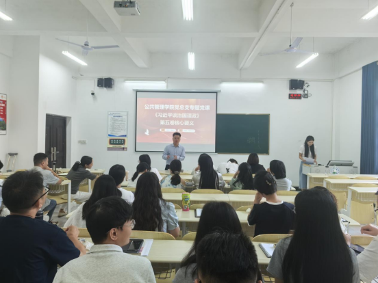 上午,公共管理学院党总支组织开展专题党课学习,党总支副书记朱孝兰同志主讲。她围绕《习近平谈治国理政》第五卷的核心内容,深入阐释了“五大核心要义”,教育引导全体党员师生干部持续深化理论武装,切实增强学习贯彻习近平新时代中国特色社会主义思想的思想自觉和行动自觉,深刻领会习近平总书记重要讲话和重要指示批示精神的核心要义与实践要求,着力将其转化为行动内驱力和生动实践。