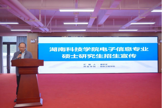 随后,湖南科技学院通信工程系主任潘学文就2025年研究生招生政策进行了全面解读。他详细介绍了报考流程、招生专业计划及奖助学金体系,为同学们提供了权威的政策指引。湖南科技学院研究生招生办主任欧红星则系统阐述相关学科的培养特色、师资力量、科研平台及就业前景,帮助同学们清晰规划学术发展与职业方向。