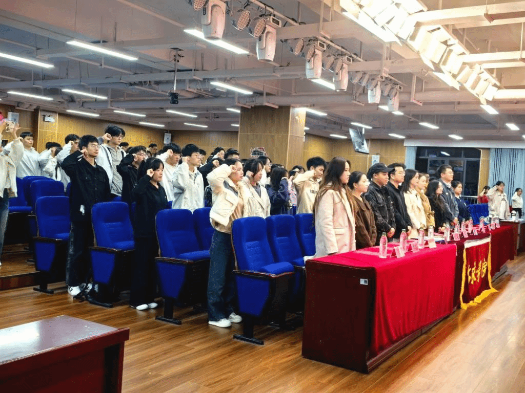 在全场师生的共同见证下,大会举行了庄重的会旗交接仪式——第七届学生会代表将象征责任与使命的会旗郑重交予第八届学生会代表,生动体现学生会工作的薪火相传,凝聚全体师生对学生工作赓续发展的美好期待。第八届学生会全体成员高举右拳、庄严宣誓,铮铮誓言中饱含着新成员们履职尽责、服务同学的坚定决心。