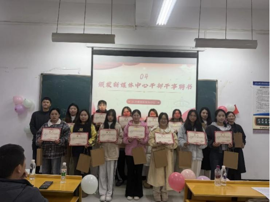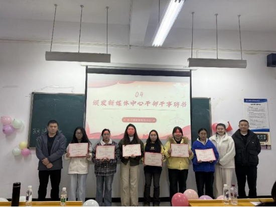 随后,在全体师生的见证下,学院老师为新一届新媒体中心干部颁发聘书,崭新的聘书不仅是身份的认证,更是一份沉甸甸的信任与期许。上一届干部代表将工作牌郑重交予新干部代表,小小的工作牌完成了使命的传承,也标志首届新媒体团队正式接棒。