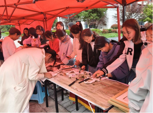 活动现场,各类精心设计的挑战关卡有序开展,吸引众多同学踊跃参与。药用植物知识答题环节,同学们凝神思索、认真作答,在答题过程中探寻本草奥秘、夯实理论基础;在药用植物蜡制标本鉴别关卡前,大家俯身细观、细致比对,从标本的纹理、形态中精准辨识药材,在实践中锤炼专业本领;植物拓染区域兼具趣味与诗意,同学们以落叶为笔、落花为墨,在布面上拓印自然肌理,将本草之美定格为独特艺术印记,充分展现创意与匠心。完成各关卡挑战的同学可收获通关印章,现场气氛热烈有序,学子们的求知与探索热情溢于言表。