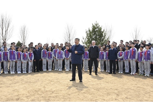 3月30日,党和国家领导人习近平、李强、赵乐际、王沪宁、蔡奇、丁薛祥、李希等来到北京市昌平区百善镇参加首都义务植树活动。这是习近平同在场的干部群众、少先队员亲切交谈。新华社记者 燕雁 摄