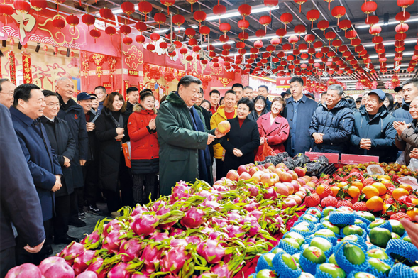 2025年1月22日至24日,中共中央总书记、国家主席、中央军委主席习近平冒着严寒来到辽宁,看望慰问基层干部群众。这是23日上午,习近平在沈阳大东副食品商场考察时,同店主和顾客亲切交流。新华社记者 王晔/摄