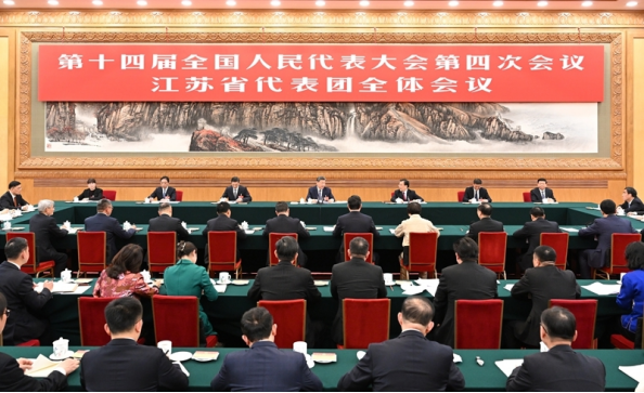 3月5日下午,中共中央总书记、国家主席、中央军委主席习近平参加他所在的十四届全国人大四次会议江苏代表团审议。新华社发(盛佳鹏 摄)