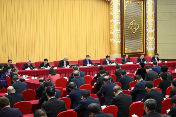 中共中央政治局常委、全国政协主席王沪宁,中共中央政治局常委、中央办公厅主任蔡奇参加看望和讨论。