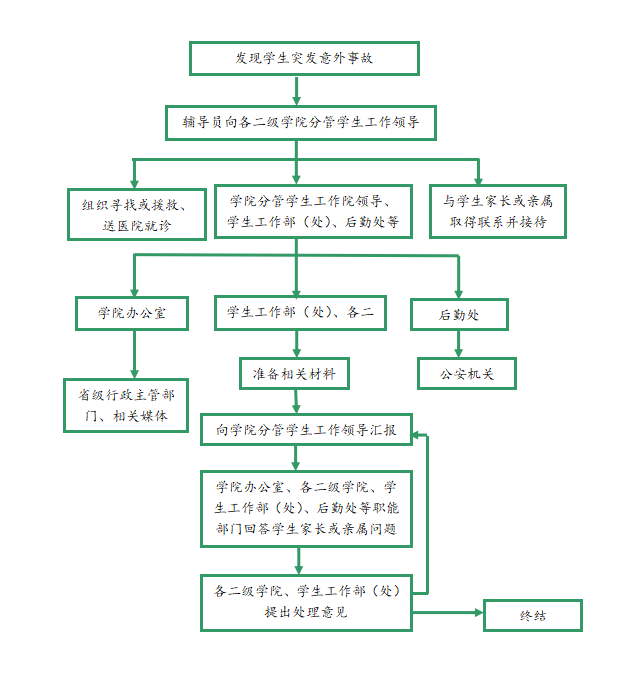 辅导员→二级学院领导→学生工作部(处)、后勤处→分管院级领导