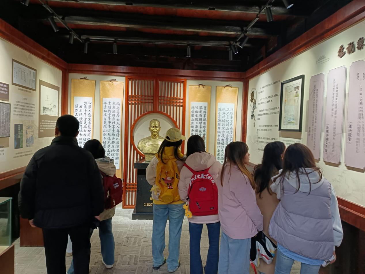 研学首站抵达黎庶昌故居陈列馆。这座坐落于沙滩村乐安江东岸的黔北民居,以木结构高架瓦房为主体,三重天井、三进院落的格局尽显古朴典雅。故居内陈列着黎庶昌生前使用的家具、文具,展示其生平事迹与著述的文字资料,以及诸多珍贵文物。讲解员绘声绘色地讲述了他早年刻苦求学,后以参赞身份随郭嵩焘、陈兰彬出使英国、法国、西班牙等国的历程,展现了他为国家争取权益、传播中华文化的卓越贡献。黎庶昌所体现的大国风范与家国情怀,深深打动了在场同学,让大家对沙滩文化的深厚底蕴有了更深刻的体会,文化自信与民族自豪感油然而生。