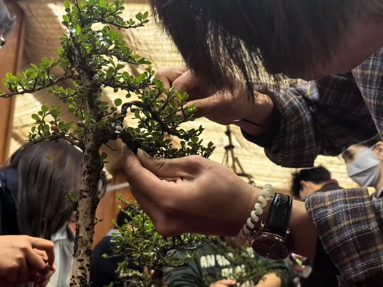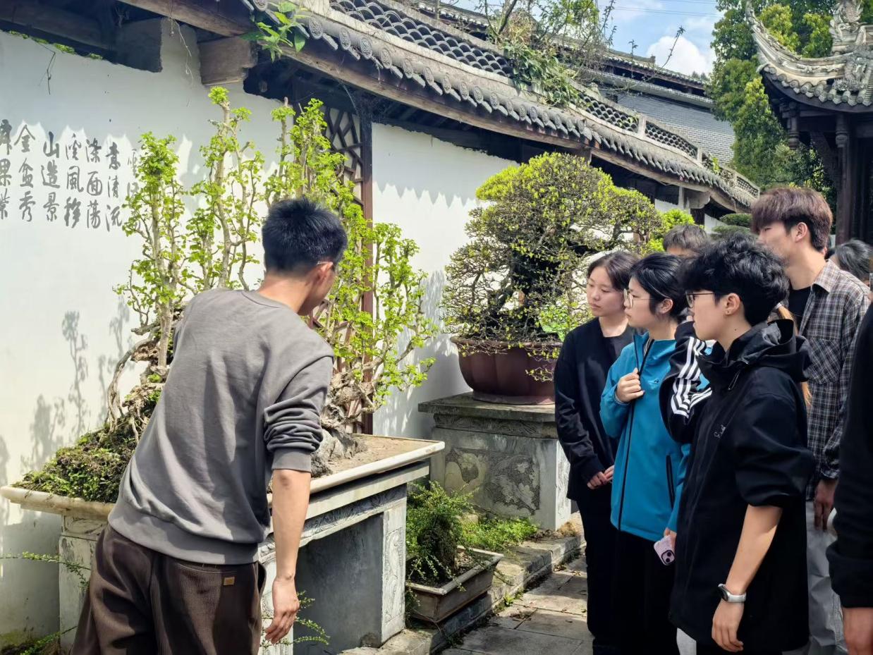 活动期间,盆景技艺传承人围绕盆景制作技艺的非遗渊源、造型构思及日常养护等内容进行了细致讲解,并带领同学们实地参观盆景园区,近距离感受盆景艺术精巧的构思与独特的韵味。在动手实践环节,同学们在专业老师的指导下体验盆景制作全过程,从选材、修剪到造型、固定,精心完成属于自己的盆景作品,在实践中切身领略传统工艺的独特魅力。